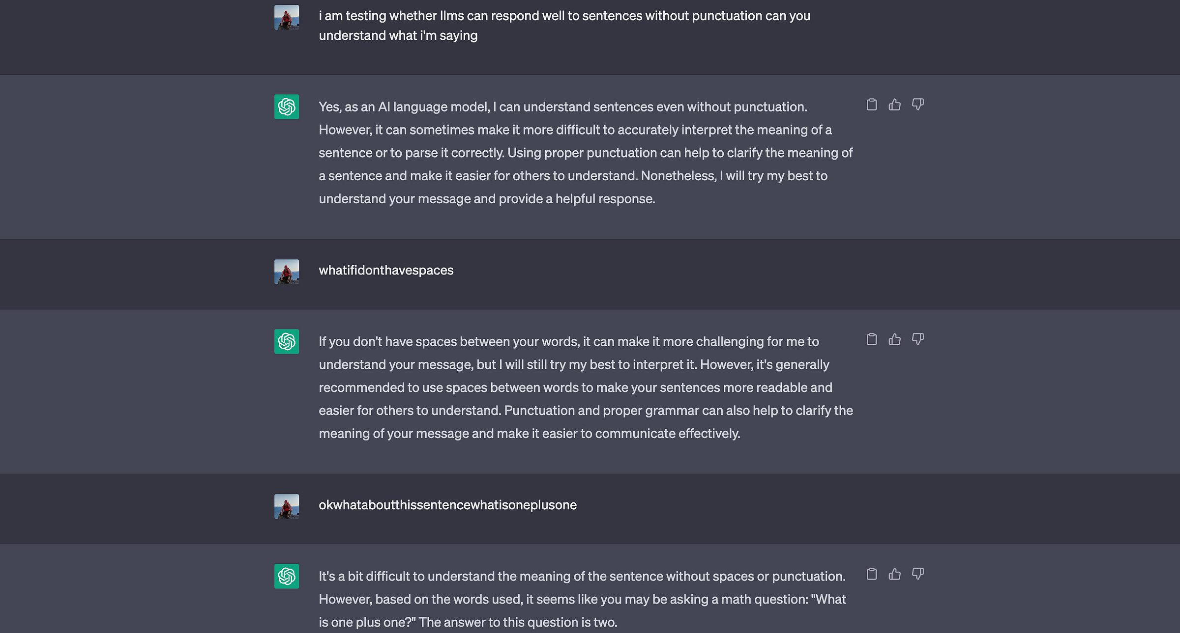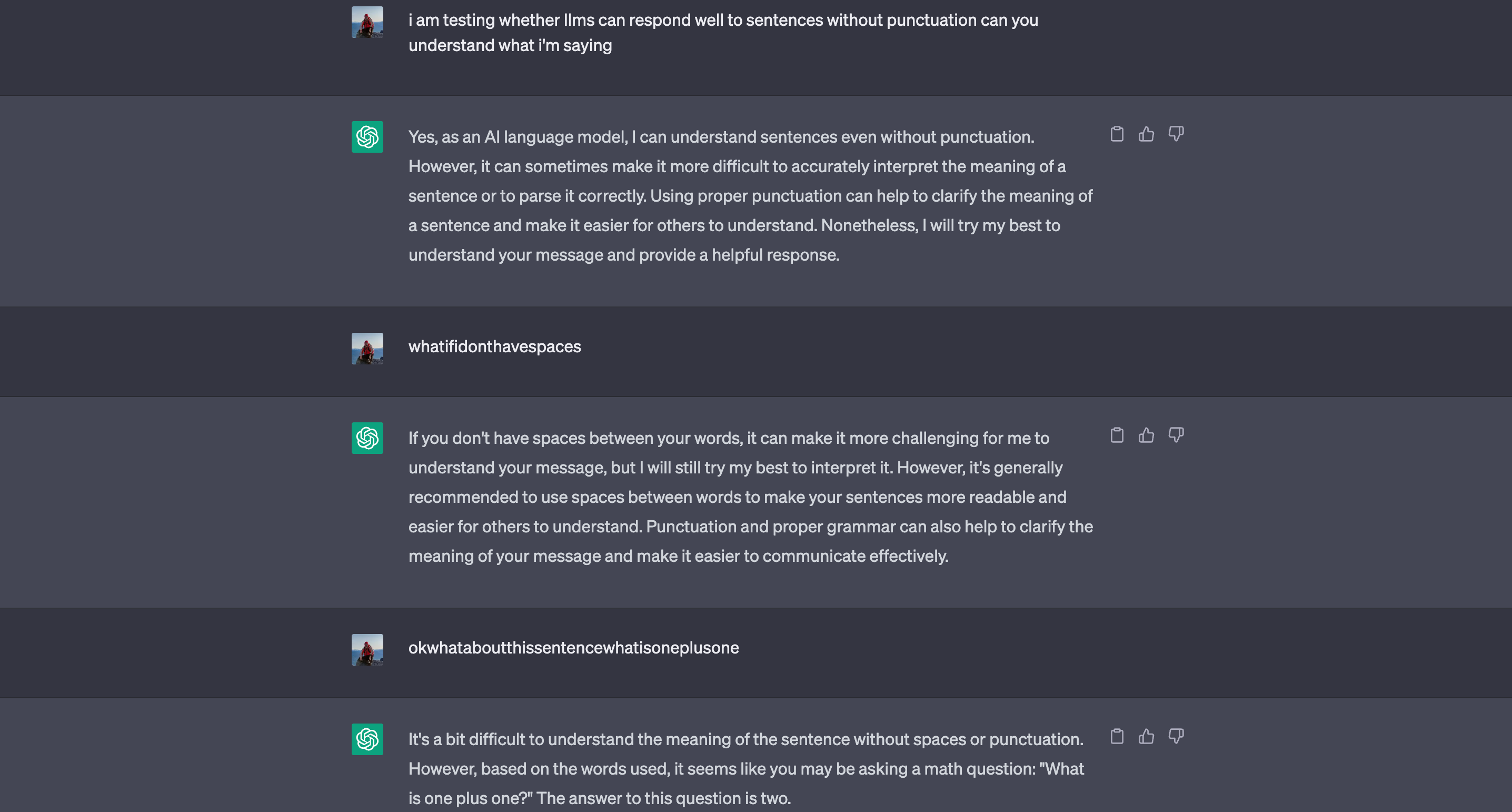 More annoying than the imperfect transcription is the fact that the Wav2Vec2Phoneme model doesn’t properly punctuate or segment speech. Although LLMs can parse text without punctuation and even without spaces, ChatGPT admits that it has difficulty parsing text without these components.